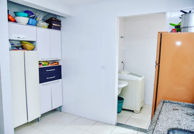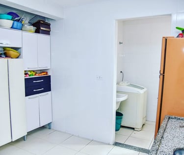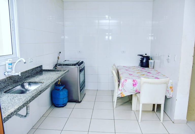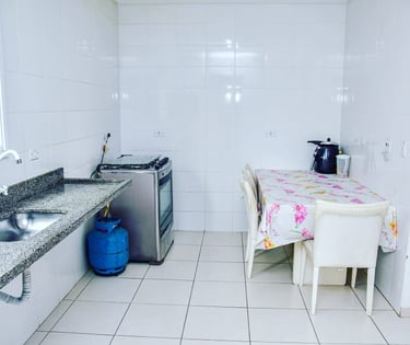 todos os utensílios panelas, garfo, faca, copos etc... completa, geladeira, fogão, gás, mesa 4 cadeira , área com maquina de lavar e tanque