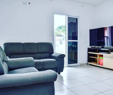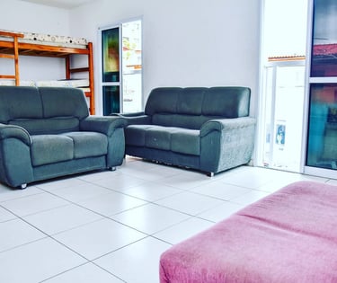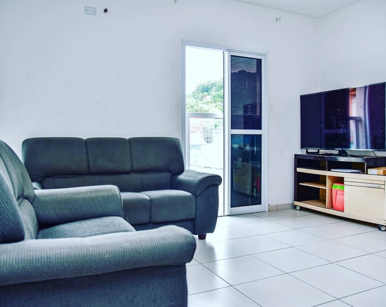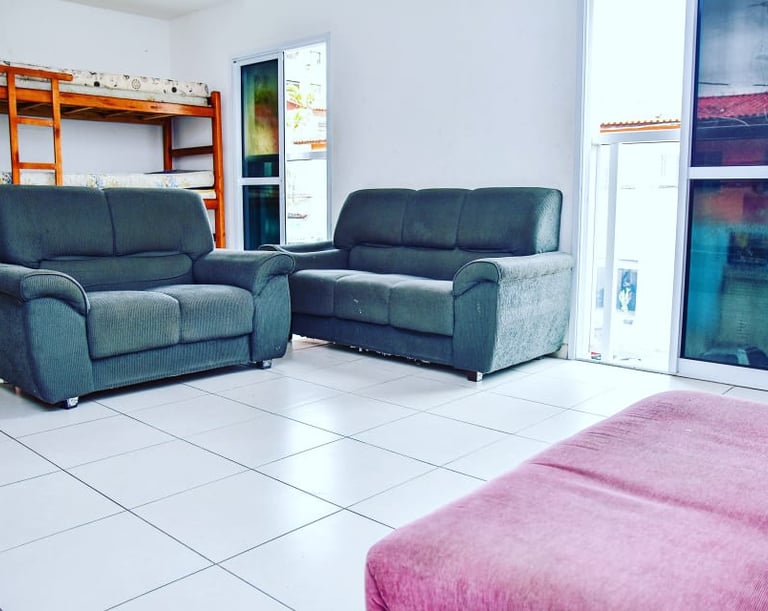 Sala Com TV 42 Polegada com netflix amazon premier, Wi-Fi de 100 mega 2 sofá 1 beliche 1 triliche 1 sofá cama banheiro e ventilador de parede.