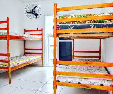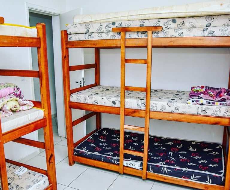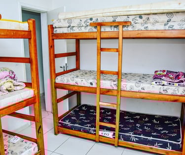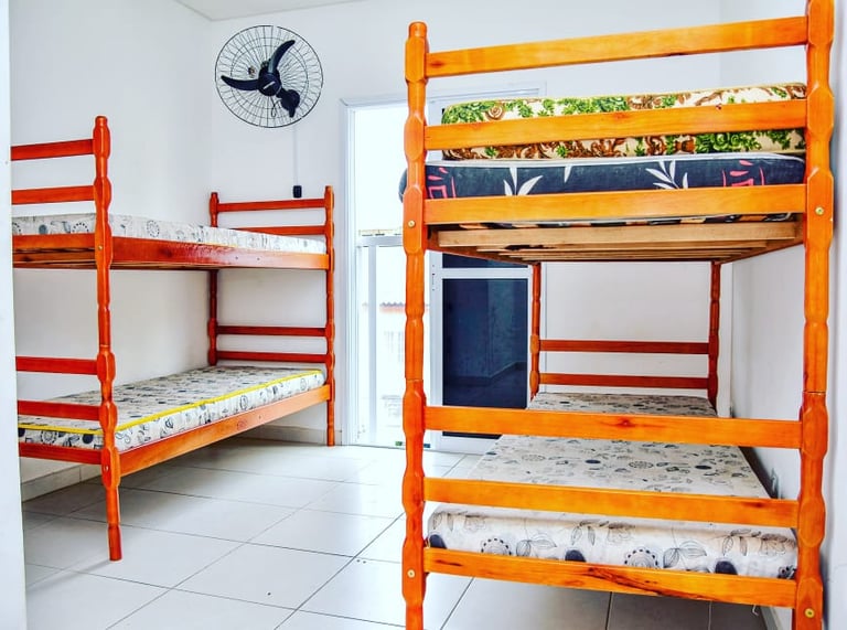 neste quarto tem 2 triliches ou seja 6 camas e um ventilador de parede e Banheiro no Corredor.